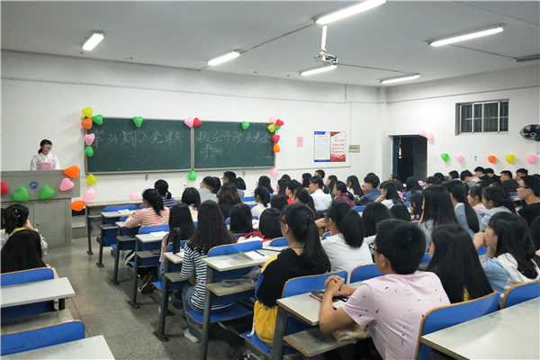 经济学部主持人刘婷宣布大会开始,全体起立,奏唱《国际歌》。优秀党员马婷结合自己的经历,对入党积极分子提出了相应要求,强调了“ 未进党的门,先做党的人”的内涵。刘婷讲到:“想成为一名党员,首先要对自己的学习负责,然后积极参加活动,保持党校学员良好形象。遇到问题积极与老师、小组成员沟通,解决困难,交流心得。”而后,入党积极分子代表邓莉丽从如何成为一名优秀的党员代表发言,强调我们要主动了解党的政策方针及相关动态。