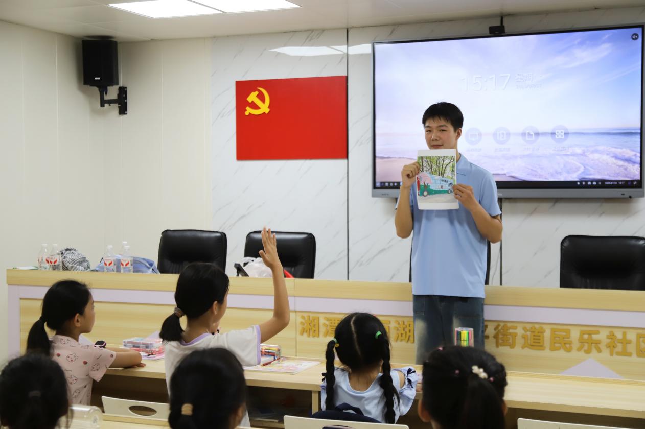 为增加社区孩子对本土文化的认知与热爱,助力提升美育素养,7月7日,湖南科技大学潇湘学院暑期“三下乡”实践团队在民乐社区开展趣味绘画课堂。本次课程由实践团成员喻庭隆进行授课,以“童心绘湘潭”为主题,带领学生探寻湘潭的建筑之美和自然之韵,鼓励小朋友们用画笔勾勒眼中独特的家乡风貌。